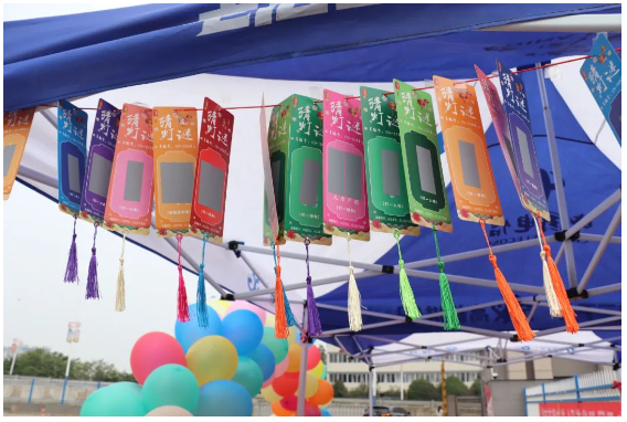 活动现场是具有节日氛围感的创意单元-猜灯谜有奖问答,问答知识涉及党建知识、工会知识、中秋古诗词、生活常识、安全生产等等。